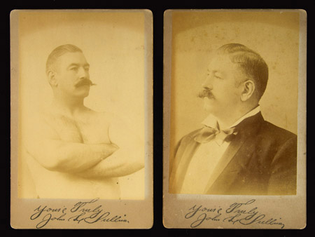 Description:Lot of (2) John L. Sullivan cabinet cards c.1890s. Pair of period 4.25"x6.5" cabinet mounts with affixed sepia toned photographs depicting Sullivan. Both bear facsimile signatures along lower border and have his fight record printed on back. Minor edge and surface wear and scattered age toning. Erased pencil notation on back of (1): Overall EX-EX/MT