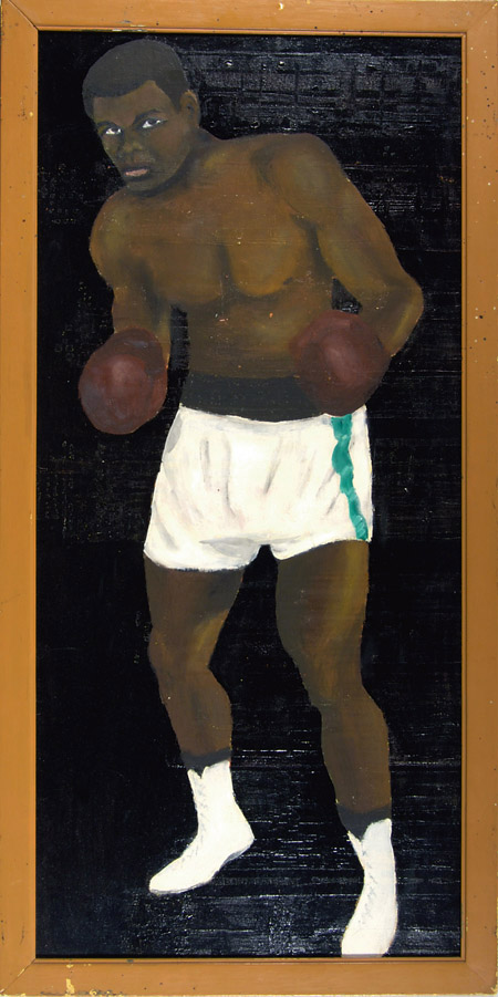 Muhammad Ali original painting c.1970s. Oil on board artwork depicting Ali in fighting stance measures 15.75"x31.75" overall. Folk art style appearance exhibits light scattered wear: EX/MT