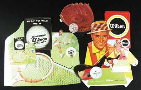 Description:1966 Wilson "Spring & Summer Displays" unused advertising kit. Original 20"x22" cardboard mailer contains die-cut cardboard stock components for several point of purchase displays including large and small golf featuring Sam Snead, tennis featuring Jack Kramer, glove portion of a baseball display (missing the larger background piece), instructions for set up, 16.75"x18.25" poster picturing Jack Kramer and advertising Wilson tennis balls and rackets, and (2) 8"x25" panoramic advertising posters (1 each for golf with Snead and Tennis with Kramer). Mailer exhibits expected handling and storage wear, die-cut pieces are unused with little to no wear, and posters exhibit light corner and edge wear with minor surface soiling (panoramas were shipped/stored folded at center). Uncommon and highly visual display pieces: Mailer VG/EX-EX, Contents EX/MT-NM