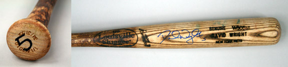 Description:David Wright autographed professional model baseball bat c.2010. Louisville Slugger 125 David Wright block letter W305M model baseball bat measures 34" long and weighs 31.5 oz. Date stamp "1/14/2010" in knob which has number "5" written on in black marker (also written on barrel end). Moderate to heavy evident usage wear with deeply embedded stitch marks, ball transfer marks, grain separation and heavy coat of pine tar. Signed on the barrel in blue marker rating 9 out of 10. Includes LOA from Hunt Auctions: Bat EX, Sig. EX/MT-NM