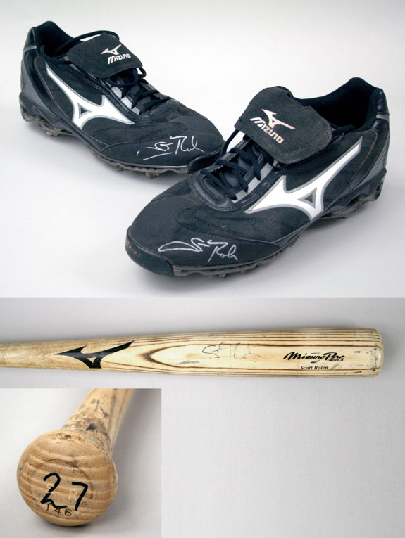 Description:Scott Rolen autographed professional model baseball bat and cleats. MizunoPro limited A model baseball bat with Scott Rolen block lettered on barrel measures 33.75" long and weighs 33 oz. "SR I46" stamped in knob end. Jersey number "27" written on both ends in black marker. Exhibits heavy usage wear with stitch marks, ball transfer marks, light grain separation, and applied coat of pine tar. Signed in black marker rating 4/5 out of 10. Also includes Mizuno 9Spike Propulsion cleats with interior size "14" tag reading "Promo Miz Pro G4." Jersey number "27" written on outside of each and both have been signed in silver paint pen rating 8/9 out of 10 and exhibit moderate usage wear. Includes LOA from Hunt Auctions: Overall EX-EX/MT