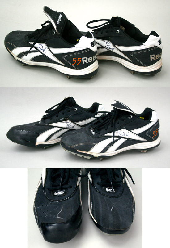 Description:Tim Lincecum autographed professional model cleats. Reebok Playdry cleats with interior "Authentic Collection" printed on labels in heel and size "10 1/2" labels on tongue also marked "PYE Sample." Number "55" embroidered on outside heel of each. Right cleat has additional rubberized toe guard applied at font. Both have been signed in black marker rating 8 out of 10 and it appears that attempts were made to sign in paint pen with hardly visible remnant remaining. Includes LOA from Hunt Auctions: EX