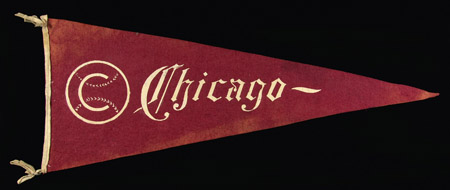 Description:Rare Chicago Cubs souvenir pennant c.1910-20. Oversized 36" long red pennant displays early "C" decoration on a baseball graphic at the left side with "Chicago" lettering in Old English script across the body of the pennant. The pennant retains its original tassels and remains in very fine overall condition for its age with a few areas of light age toning/fading to the bottom edge and top left corners areas. One of the earliest Chicago Cubs pennants that we have encountered: VG-EX
