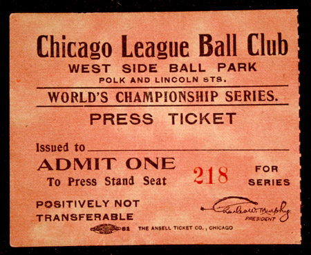 Description:1906 World Series press ticket. 2.5"x3" Paper stock press ticket allowed bearer entrance to the West Side Ball Park. Although year is not stated, this was the only series in the early part of the 20th Century in which the White Sox used that venue (which is noted) to host their post-season games. Exhibits very light edge and corner wear with neatly torn right edge: EX/MT