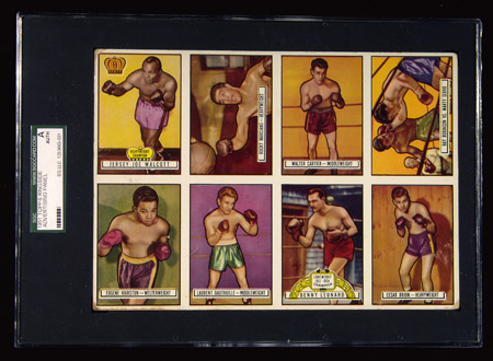 Description:Uncommon 1951 Topps Ringside boxing card advertising panel. 6"x8.25" Uncut sheet displaying front of (8) cards from the set including Walcott, Marciano, Robinson vs. Servo, and B.Leonard. Back displays colorful fight scene. Light edge and surface wear with rounded corners. Minor paper loss at (3) corners. Encapsulated "Authentic" by SGC: VG-VG/EX