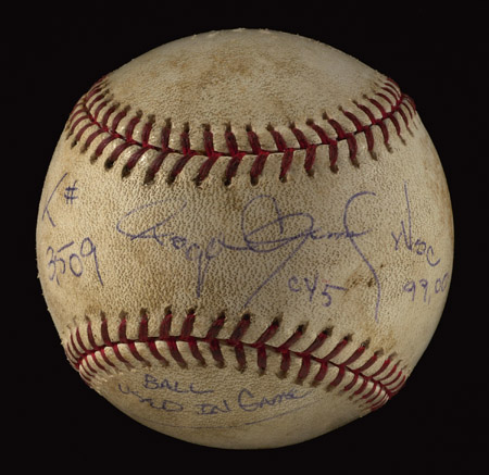 Description:Roger Clemens autographed record setting 3,509th strike-out game used baseball. Rawlings B.Selig OML baseball has been signed on the sweet spot with added "CY5", "WSC 99, 00", and "K # 3,509 Ball used in game" inscriptions. The blue ink signature rates 8 out of 10. Ball exhibits soiling and usage wear. Clemens pitched the 2001 season opener for the NY Yankees and struck out (5) to pass Walter Johnson on the all-time list and become the American League's strikeout King. Includes full LOA from JSA: Ball EX, Sig. EX/MT-NM
