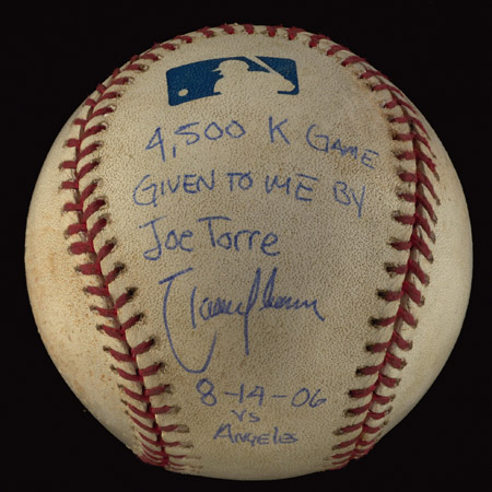 Description:Aug. 14, 2006 Randy Johnson 4,500th strikeout game used baseball. Rawlings B.Selig OML baseball has been signed on the side panel with added "4,500 K Game, given to me by Joe Torre, 8-14-06 vs. Angles" inscription. The blue ink signature rates 8/9 out of 10. Ball exhibits soiling and usage wear. Johnson is one of only three pitchers to have reached the elusive plateau and putting the achievement into context, there is no current player whom is within 2,000 of meeting the mark. Includes full LOA from PSA/DNA (grading per their letter is auto - 9, ball - 6): Ball EX, Sig. EX/MT-NM