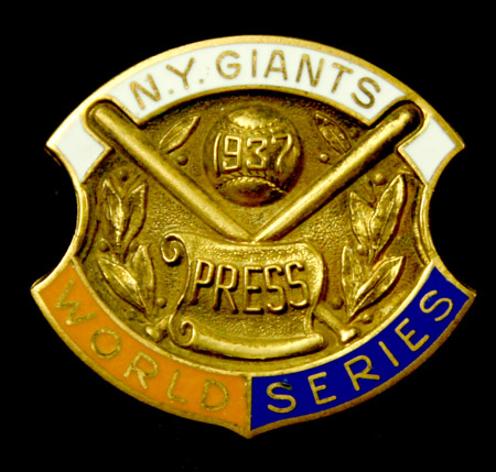 Description:1937 N.Y. Giants World Series press pin. Original pin marked Dieges & Clust 1/20 10K GF (gold filled) on the back. Minor wear to enameled portion with scattered light tarnish. Threaded post back retains screw down closure. Affixed to original cardboard backing as issued: Pin EX-EX/MT, Card EX