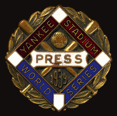 Description:1939 New York Yankees World Series press pin. Original pin marked "Dieges & Clust" on back. Threaded post back retains screw down clasp. Exhibits minor scattered wear and tarnish with very small chip to enameled portion: EX-EX/MT