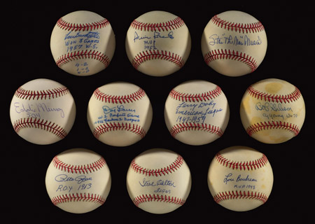Description:Lot of (10) Hall of Famers and Stars single signed baseballs with inscriptions. All Official American, National, or Major League baseballs signed on the sweet spot incl. Musial, Carlton, Rose, Gibson, Burdette, Murray, Larsen, Doby, Boudreau, and Roberts. Each has added a career relevant inscription. Blue ink signatures rate 8-9 out of 10. Minor scattered toning (Gibson more pronounced). Includes LOA from JSA: Range EX-NM (Avg EX/MT)