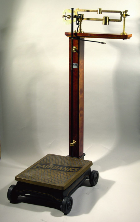 Description:1930s Fairbanks weigh-in scale attributed to Grand Olympic Auditorium. The Grand Olympic Auditorium opened in Los Angeles in 1925 and in the decades that followed, became one of the most storied boxing venues in history. More than 100 Championship fights took place there, and in more recent times, the film Rocky used it as a backdrop. The offered scale was obtained by our consignor from the widow of a former employee and is believed to have been used as a their weigh in scale for many decades. Substantial Fairbanks wheeled base scale has been beautifully restored with wooden sections done in Tiger Palm Mahogany. Stands 59" tall with a footprint of approximately 33"x20". In approximate working order. Exhibits scattered wear typical for the age and likely level of use with most have been cleaned during restoration. Few small scuff marks to wooden section: EX/MT