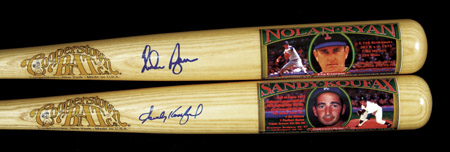 Description:Sandy Koufax and Nolan Ryan autographed baseball bats. Pair of Cooperstown Bat Co. bats from the Famous Pitcher series, each signed in blue marker. Signatures rate 9/10 out of 10. Includes LOA from JSA and original manuf. certificates: EX/MT-NM