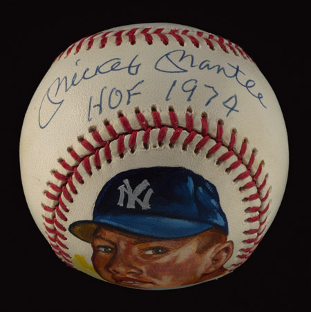 Description:Mickey Mantle single signed baseball with portrait. B.Brown OAL baseball has been signed on the sweet spot by Mickey Mantle with added "HOF 1974" inscription. The blue ink signature rates 9 out of 10. A portrait of Mantle has been hand painted on the panel below. Includes full LOA from PSA/DNA: EX/MT-NM