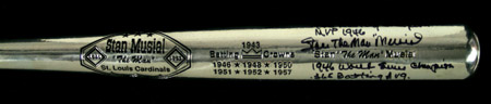 Description:Stan Musial autographed limited edition silver statistics bat. Substantive metal plated baseball bat with "Stan The Man Musial" center brand and additional engraved "Batting Crowns" logo has been signed on the barrel in black marker. In addition, Musial has inscribed a number of statistics related to his 1946 season which was arguably the best of his career. Signature rates 9 out of 10 with (1) very minor smudge to "1946" in the inscription. Numbered 5/46. Includes LOA from JSA: EX/MT-NM