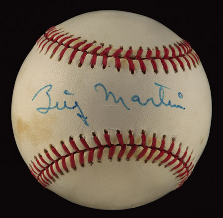 Description:Billy Martin single signed baseball. Rawlings B.Brown OAL baseball has been signed on the sweet spot in blue marker. Signature rates 8 out of 10. Ball exhibits minor scattered toning. Includes full LOA from JSA: EX/MT