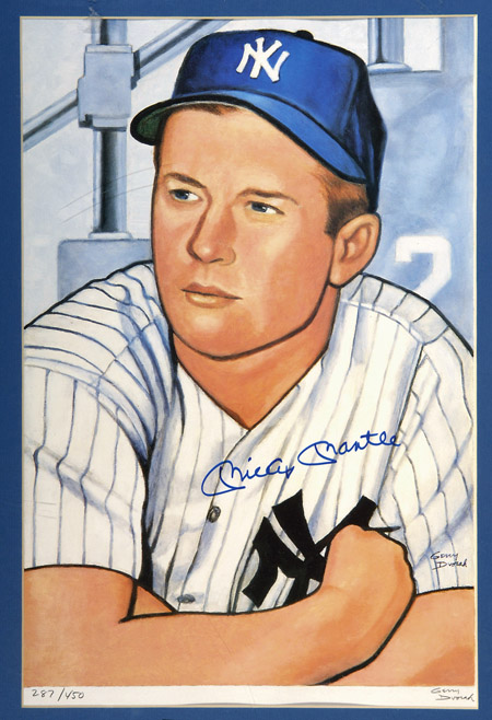 Description:Mickey Mantle auto. 1952 Bowman artwork print. Matted and framed print of Gerry Dvorak artwork is signed by Mantle across the front in blue sharpie. Signature rates 9 out of 10. Print is also signed by the artist and numbered 287/450. Overall dimensions 16"x22". Includes LOA from JSA: NM