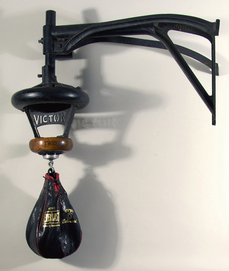 Description:Vintage Victor Sporting Goods wall mount speed bag holder c.1910s. Substantive wall mountable speed bag holder with "Victor" company logo stenciled out retains original wooden mounting platform which is marked with the company logo and 1920 patent date. Has had a modern era Everlast mount affixed and includes matching bag for functionality. Expected wear throughout retaining fine display qualities: EX-EX/MT