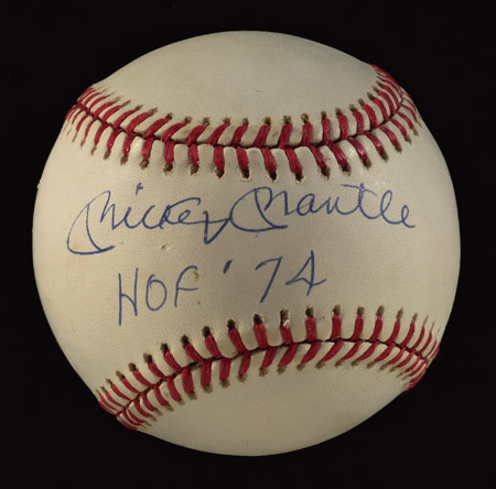 Description:Mickey Mantle single signed baseball with HOF inscription. Rawlings B.Brown OAL baseball has been signed on the sweet spot with added "HOF 74" inscription. The blue ink signature rates 9 out of 10. Extremely minor scattered spots of toning mentioned for sake of accuracy. Includes LOA from JSA and has Mickey Mantle Museum authentication hologram affixed: EX/MT-NM