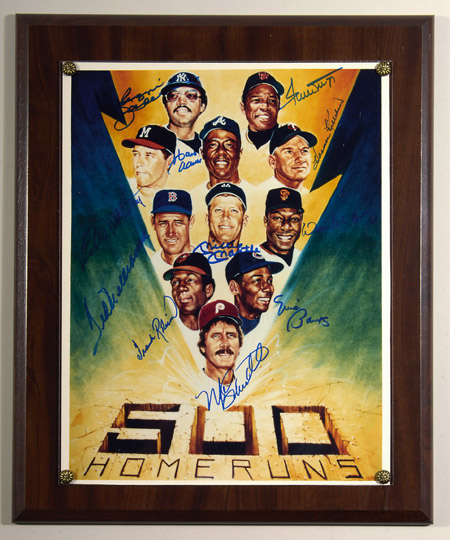Description:500 Home Run Club autographed photograph. 11"x14" Color photographic print of famed Ron Lewis lightening bolt artwork has been signed by (11) including Mantle, Williams, Aaron, Mays, Jackson, Banks, and others. Blue marker signatures rate 8-9 out of 10. Mounted to wooden plaque backing. Includes LOA from JSA: EX/MT-NM