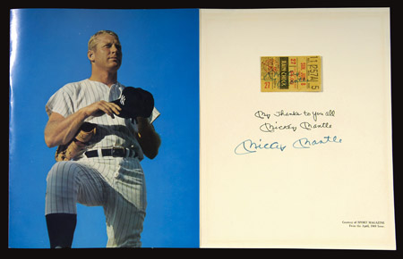 Description:Mickey Mantle autographed June 8, 1969 Mantle Day ticket stub and program page. Scarce original June 8, 1969 ticket stub from the day which New York Mayor declared "Mickey Mantle Day" and the Yankees retired his fabled jersey number 7. Exhibits general handling wear and light surface creasing with neatly trimmed torn edge. Mounted to a page from the Mantle Day program (which in turn has mounting residue on reverse). Both pieces have been signed in blue marker rating 8/9 out of 10. Comes with additional full copy of the program for display. Includes LOA from JSA: Stub/Page EX-EX/MT, Sigs. EX/MT-NM