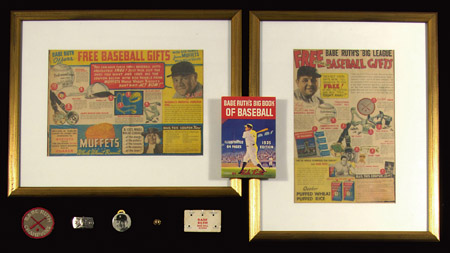 Description:Lot of (6) Babe Ruth Quaker Oats premiums and (2) advertisements c.1930s. Includes 1.75" watch fob/scorer, 1"x2" metal belt buckle, 3" "Babe Ruth Champions" patch, metal ring, heavy paper stock scorer, and "Babe Ruth's Big Book of Baseball." Scattered mostly light wear throughout with slightly more to ring and scorer. Includes pair of framed period newsprint advertisements depicting Ruth and various Quaker redemption items (all included are pictured): Range VG/EX-EX/MT, Avg. EX