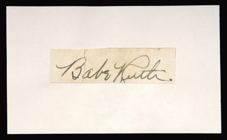 Description:Babe Ruth autographed cut signature. 1"x3" Vintage fountain pen signature affixed to standard sized 3"x5" unlined index card. Signature rates 8 out of 10. It appears a separation through the "B" has been remedied by affixing to the card. Includes LOA from JSA: EX