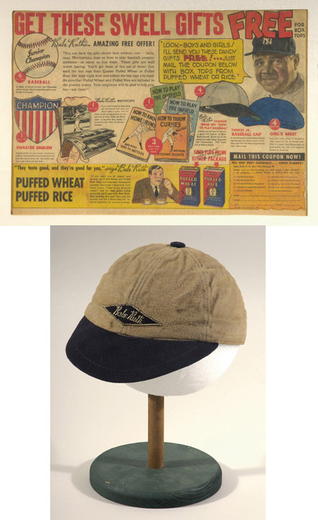 Description:Scarce "Babe Ruth" Quaker Oats premium hat c.1930s. Two tone felt hat with affixed "Babe Ruth" patch on front as offered by Quaker Oats as a box top redemption. Exhibits light wear and scattered surface soiling with interior leather band largely intact. Includes framed period newsprint advertisement depicting Ruth and various redemption prizes including a similarly styled hat: Overall EX-EX/MT
