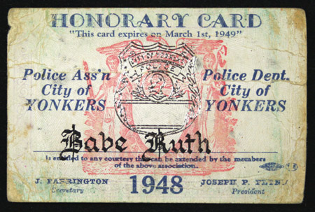 1948 Babe Ruth City of Yonkers Police Dept. courtesy card. 2.5"x4" Paper stock card with "Babe Ruth" handwritten on front in calligraphic style. Exhibits corner, edge, and surface wear with creasing. Period ink notation on back: VG-VG/EX
