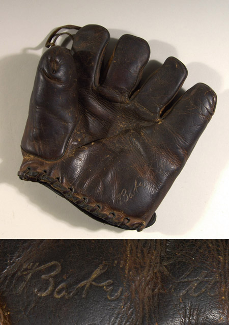 Description:Babe Ruth store model baseball glove c.1930s. Left handed glove with "Spalding" manufacturers stampings on strap button has highly visible Ruth facsimile signature in palm. Exhibits usage wear incl. surface soiling/crackling with scattered areas of surface loss mostly to non-display side: VG/EX-EX