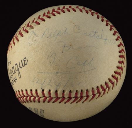 Description:Ty Cobb single signed baseball. Wilson "Official League" baseball has been signed on the side panel, "To Ralph Crutchfield, from Ty Cobb 12/24/60." The blue ink signature rates 6/7 out of 10 remaining highly legible. Ball exhibits light even toning. Includes full LOA from JSA: Ball EX/MT, Sig. EX-EX/MT