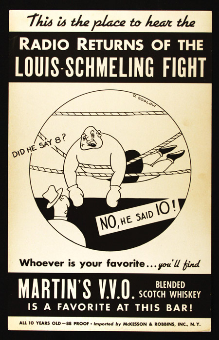 Description:Joe Louis vs. Max Schmeling fight broadcast advertising display c.1930s. 14"x22" Heavy stock display by Martin's V.V.O. Blended Scotch Whiskey advertising the radio broadcast. Minor age toning with scattered minimal surface and edge wear: EX-EX/MT
