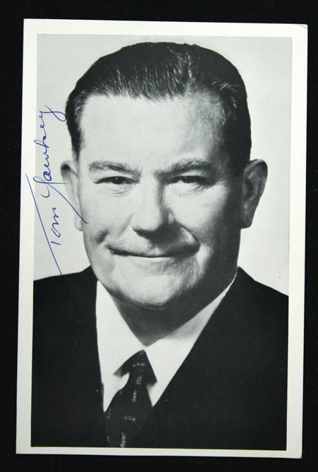 Tom Yawkey autographed postcard photograph. 3.75"x5.5" Black and white postcard sized photograph has been signed on the front, "Tom Yawkey." The blue ink signature rates 9 out of 10. Includes LOA from JSA: EX/MT