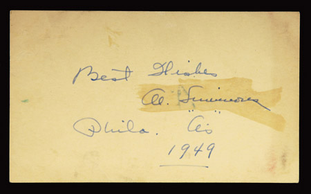 Description:Al Simmons autographed Government Postcard. Signed on the front in vintage ink with added salutation rating 8/9 out of 10. Exhibits light scattered surface soiling and expected wear with clear coat applied over signature. Includes LOA from JSA: EX/MT