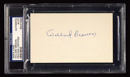 Description:Willard Brown autographed index card. 3"x5" index card has been signed on the front in blue ink rating 9 out of 10. Bold example offering fine display qualities on unlined index card. Authenticated by PSA/DNA and slabbed "Authentic": EX/MT-NM