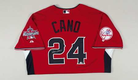 Description:2010 Robinson Cano autographed American League All-Star Game Workout Day/Home Run Derby Jersey. Red knit jersey has "American" lettering across the front and "Cano" on the back. Cano has signed the shirt in silver paint pen on the #2. The New York Yankees team patch is affixed to the right sleeve with MLB All-Star Game logo patch on the left sleeve. Majestic label found on tail front with "Cool Base" and size 48 flag tags affixed to the seam. Jersey has an affixed MLB hologram FJ171089 on the back and proper 0068 wash tag on the interior. Includes LOA from JSA: NM