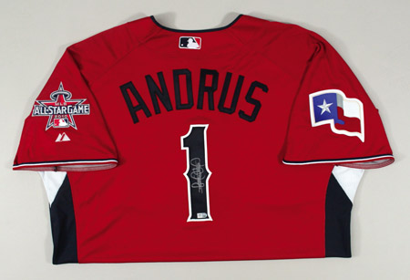 Description:2010 Elvis Andrus autographed American League All-Star Game Workout Day/Home Run Derby Jersey. Red knit jersey has "American" lettering across the front and "Andrus" on the back. Andrus has signed the shirt in silver paint pen on the #1. The Texas Rangers team patch is affixed to the right sleeve with MLB All-Star Game logo patch on the left sleeve. Majestic label found on tail front with "Cool Base" and size 48 flag tags affixed to the seam. Jersey has an affixed MLB hologram FJ171056 on the back and proper 0068 wash tag on the interior. Includes LOA from JSA: NM