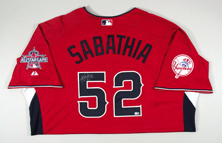 Description:2010 CC Sabathia autographed American League All-Star Game Workout Day/Home Run Derby Jersey. Red knit jersey has "American" lettering across the front and "Sabathia" on the back. Sabathia has signed the shirt in silver paint pen on the #5. The New York Yankees team patch is affixed to the right sleeve with MLB All-Star Game logo patch on the left sleeve. Majestic label found on tail front with "Cool Base" and size 56 flag tags affixed to the seam. Jersey has an affixed MLB hologram FJ171070 on the back and proper 0068 wash tag on the interior. Includes LOA from JSA: NM