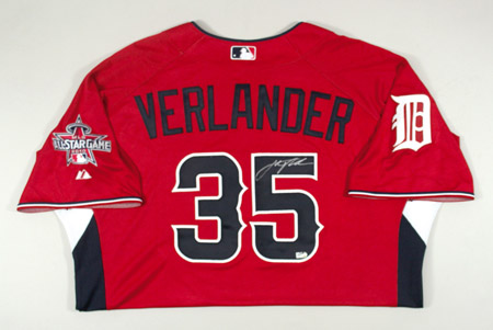 Description:2010 Justin Verlander autographed American League All-Star Game Workout Day/Home Run Derby Jersey. Red knit jersey has "American" lettering across the front and "Verlander" on the back. Verlander has signed the shirt in silver paint pen on the #5. The Detroit Tigers team patch is affixed to the right sleeve with MLB All-Star Game logo patch on the left sleeve. Majestic label found on tail front with "Cool Base" and size 50 flag tags affixed to the seam. Jersey has an affixed MLB hologram FJ171052 on the back and proper 0068 wash tag on the interior. Includes LOA from JSA: NM