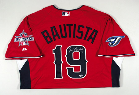 Description:2010 Jose Bautista autographed American League All-Star Game Workout Day/Home Run Derby Jersey. Red knit jersey has "American" lettering across the front and "Bautista" on the back. Bautista has signed the shirt in silver paint pen on the #9. The Toronto Blue Jays team patch is affixed to the right sleeve with MLB All-Star Game logo patch on the left sleeve. Majestic label found on tail front with "Cool Base" and size 46 flag tags affixed to the seam. Jersey has an affixed MLB hologram FJ171068 on the back and proper 0068 wash tag on the interior. Includes LOA from JSA: NM