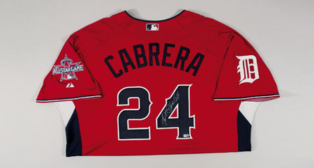 Description:2010 Miguel Cabrera autographed American League All-Star Game Workout Day/Home Run Derby Jersey. Red knit jersey has "American" lettering across the front and "Cabrera" on the back. Cabrera has signed the shirt in silver paint pen on the #4. The Detroit Tigers team patch is affixed to the right sleeve with MLB All-Star Game logo patch on the left sleeve. Majestic label found on tail front with "Cool Base" and size 52 flag tags affixed to the seam. Jersey has an affixed MLB hologram FJ171079 on the back and proper 0068 wash tag on the interior. Includes LOA from JSA: NM