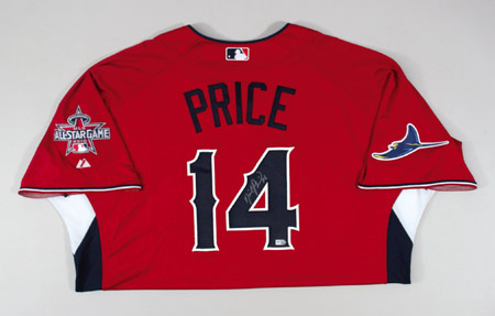 Description:2010 David Price autographed American League All-Star Game Workout Day/Home Run Derby Jersey. Red knit jersey has "American" lettering across the front and "Price" on the back. Price has signed the shirt in silver paint pen on the #4. The Tampa Bay Rays team patch is affixed to the right sleeve with MLB All-Star Game logo patch on the left sleeve. Majestic label found on tail front with "Cool Base" and size 52 flag tags affixed to the seam. Jersey has an affixed MLB hologram FJ171063 on the back and proper 0068 wash tag on the interior. Includes LOA from JSA: NM