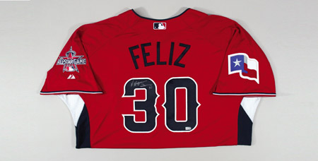 Description:2010 Neftali Feliz autographed American League All-Star Game Workout Day/Home Run Derby Jersey. Red knit jersey has "American" lettering across the front and "Feliz" on the back. Feliz has signed the shirt in silver paint pen on the #3. The Texas Rangers team patch is affixed to the right sleeve with MLB All-Star Game logo patch on the left sleeve. Majestic label found on tail front with "Cool Base" and size 50 flag tags affixed to the seam. Jersey has an affixed MLB hologram FJ171061 on the back and proper 0068 wash tag on the interior. Includes LOA from JSA: NM