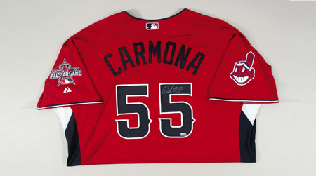 Description:2010 Fausto Carmona autographed American League All-Star Game Workout Day/Home Run Derby Jersey. Red knit jersey has "American" lettering across the front and "Carmona" on the back. Carmona has signed the shirt in silver paint pen on the #5. The Cleveland Indians team patch is affixed to the right sleeve with MLB All-Star Game logo patch on the left sleeve. Majestic label found on tail front with "Cool Base" and size 54 flag tags affixed to the seam. Jersey has an affixed MLB hologram FJ171062 on the back and proper 0068 wash tag on the interior. Includes LOA from JSA: NM