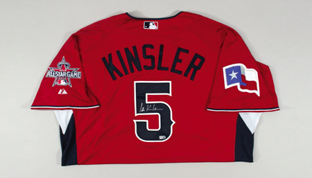 Description:2010 Ian Kinsler autographed American League All-Star Game Workout Day/Home Run Derby Jersey. Red knit jersey has "American" lettering across the front and "Kinsler" on the back. Kinsler has signed the shirt in silver paint pen on the #5. The Texas Rangers team patch is affixed to the right sleeve with MLB All-Star Game logo patch on the left sleeve. Majestic label found on tail front with "Cool Base" and size 48 flag tags affixed to the seam. Jersey has an affixed MLB hologram FJ171054 on the back and proper 0068 wash tag on the interior. Includes LOA from JSA: NM
