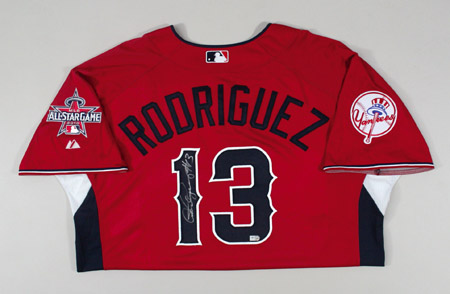 Description:2010 Alex Rodriguez autographed American League All-Star Game Workout Day/Home Run Derby Jersey. Red knit jersey has "American" lettering across the front and "Rodriguez" on the back. Rodriguez has signed the shirt in silver paint pen on the #1. The New York Yankees team patch is affixed to the right sleeve with MLB All-Star Game logo patch on the left sleeve. Majestic label found on tail front with "Cool Base" and size 48 flag tags affixed to the seam. Jersey has an affixed MLB hologram FJ171090 on the back and proper 0068 wash tag on the interior. Includes LOA from JSA: NM