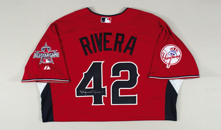 Description:2010 Mariano Rivera autographed American League All-Star Game Workout Day/Home Run Derby Jersey. Red knit jersey has "American" lettering across the front and "Rivera" on the back. Rivera has signed the shirt in silver paint pen on the #4. The New York Yankees team patch is affixed to the right sleeve with MLB All-Star Game logo patch on the left sleeve. Majestic label found on tail front with "Cool Base" and size 48 flag tags affixed to the seam. Jersey has an affixed MLB hologram FJ095683 on the front and proper 0068 wash tag on the interior. Includes LOA from JSA: NM