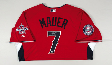 Description:2010 Joe Mauer autographed American League All-Star Game Workout Day/Home Run Derby Jersey. Red knit jersey has "American" lettering across the front and "Mauer" on the back. Mauer has signed the shirt in silver paint pen on the #7. The Minnesota Twins team patch is affixed to the right sleeve with MLB All-Star Game logo patch on the left sleeve. Majestic label found on tail front with "Cool Base" and size 52 flag tags affixed to the seam. Jersey has an affixed MLB hologram FJ171073 on the back and proper 0068 wash tag on the interior. Includes LOA from JSA: NM