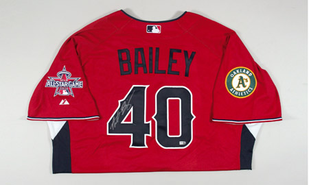 Description:2010 Andrew Bailey autographed American League All-Star Game Workout Day/Home Run Derby Jersey. Red knit jersey has "American" lettering across the front and "Bailey" on the back. Bailey has signed the shirt in silver paint pen on the #4. The Oakland Athletics team patch is affixed to the right sleeve with MLB All-Star Game logo patch on the left sleeve. Majestic label found on tail front with "Cool Base" and size 50 flag tags affixed to the seam. Jersey has an affixed MLB hologram FJ171082 on the back and proper 0068 wash tag on the interior. Includes LOA from JSA: NM