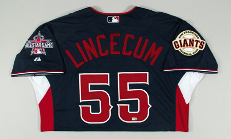 Description:2010 Tim Lincecum autographed National League All-Star Game Workout Day/Home Run Derby Jersey. Navy blue knit jersey has "National" lettering across the front and "Lincecum" on the back. Lincecum has signed the shirt in black paint pen on the #5. The San Francisco Giants team patch is affixed to the right sleeve with MLB All-Star Game logo patch on the left sleeve. Majestic label found on tail front with "Cool Base" and size 44 flag tags affixed to the seam. Jersey has an affixed MLB hologram FJ177208 on the back and proper 0068 wash tag on the interior. Includes LOA from JSA: NM