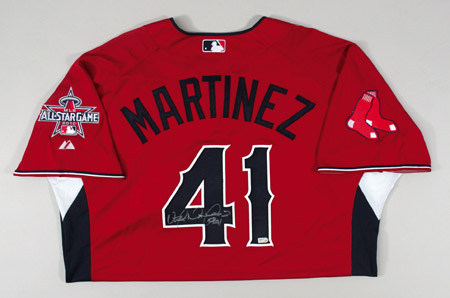 Description:2010 Victor Martinez autographed American League All-Star Game Workout Day/Home Run Derby Jersey. Red knit jersey has "American" lettering across the front and "Martinez" on the back. Martinez has signed the shirt in silver paint pen on the #4. The Boston Red Sox team patch is affixed to the right sleeve with MLB All-Star Game logo patch on the left sleeve. Majestic label found on tail front with "Cool Base" and size 48 flag tags affixed to the seam. Jersey has an affixed MLB hologram FJ171075 on the back and proper 0068 wash tag on the interior. Includes LOA from JSA: NM